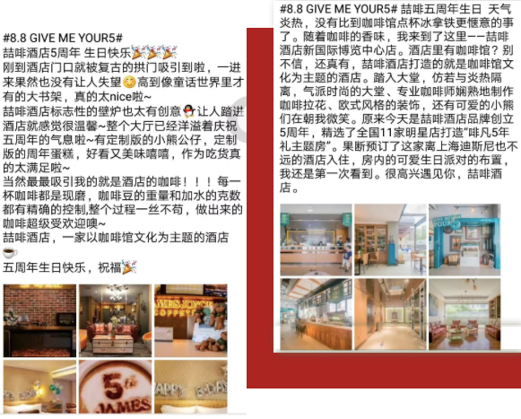五周年期间,喆啡11家明星店推出了啡凡主题房,受到了喆粉和各路旅游达人的喜爱。各路旅游达人、摄影大师从不同的城市前来,体验喆啡倾情打造的啡凡5年礼主题房。精心布置的派对主题房获得喆粉的一路好评,纷纷在社交媒体平台高调晒出好评体验感。